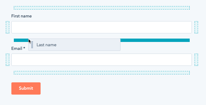 - 페이지의 왼쪽에는 양식에 추가할 수 있는 필드 목록이 있습니다. 양식에 원하는이름및 성필드를 페이지 오른쪽에 끌어다 놓습니다.