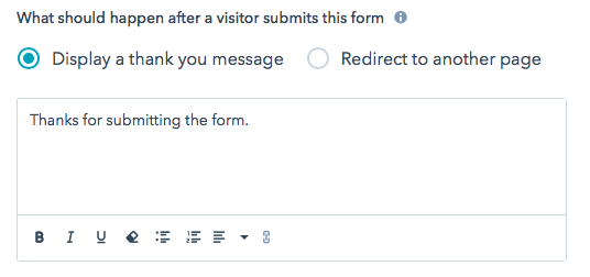 - 방문자가 이 양식을 제출한 후 수행할 작업에대해 감사 메시지 표시를클릭합니다. 기본 메시지는 절대로 표시되지 않으므로 유지합니다.
