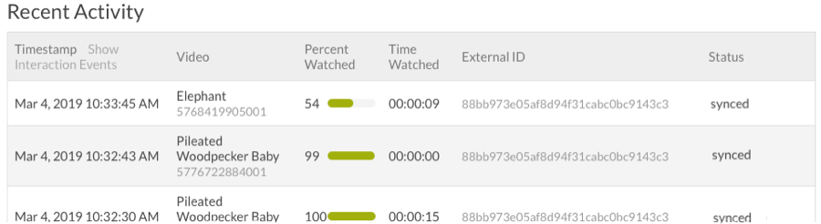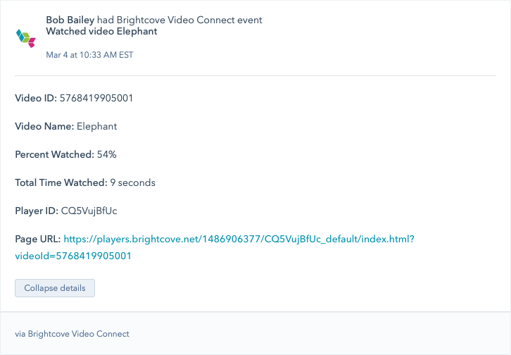- 활동 로그에서User_Name에 브라이트코브 비디오 연결 이벤트가 있었다는활동을 찾습니다. 비디오 보기 이벤트에 대한 데이터를 보려면세부 정보 표시를클릭합니다.