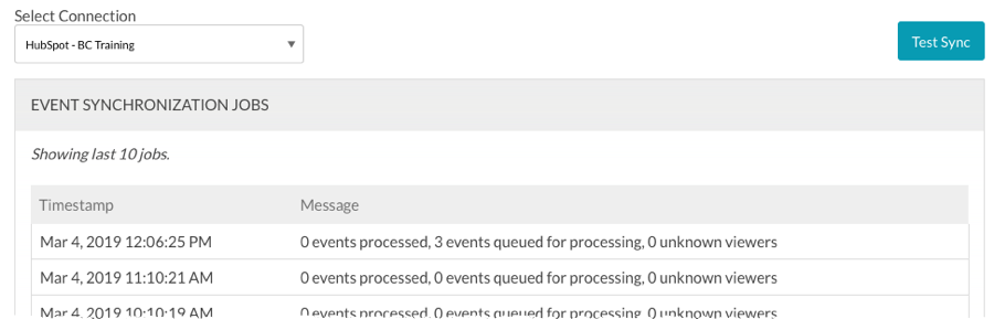 - 동기화 테스트를클릭하여 수동 동기화를 트리거합니다. 수동 동기화를 트리거할 수 있는 빈도로만 제한됩니다. 기본적으로 청중은 한 시간에 한 번씩 HubSpot에 보기를 동기화합니다.