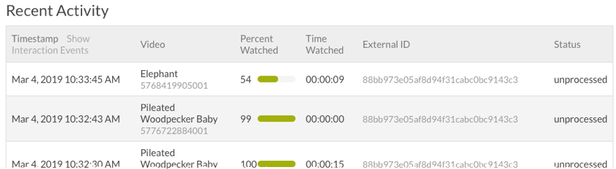 - 방금 시청한 비디오의 이름을 보여주는 최근 타임스탬프가 있는 이벤트가 있는지 확인합니다. 이벤트 상태는처리되지않아야 합니다. 이는 시청자가 뷰를 캡처했지만 아직 HubSpot에 동기화를 시도하지 않았음을 나타냅니다.